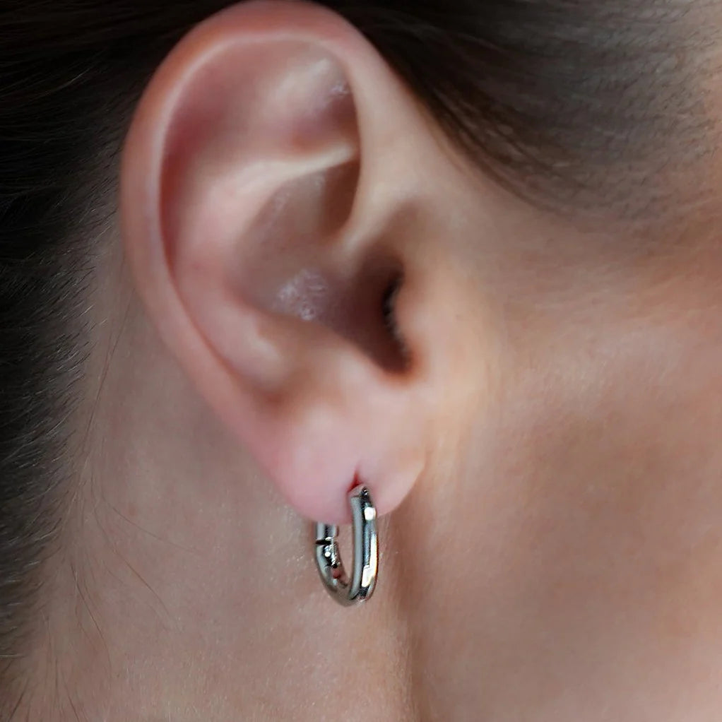 A modern take on the hoop earrings. These rectangular hoops with rounded corners will add a new option to your style arsenal.