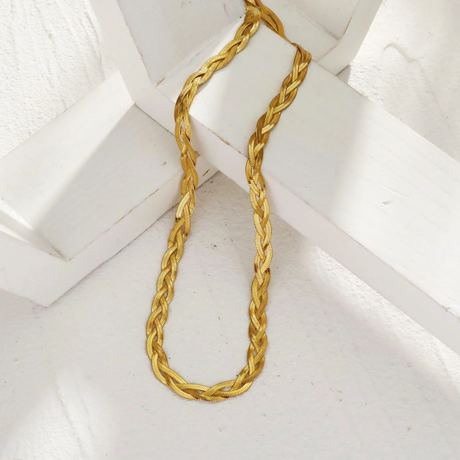 Like shimmering streams, a trio of herringbone textured strands intertwine to create a unique piece of jewellery. Comfortably light, wear this contemporary necklace to add a sophisticated touch to your outfit.